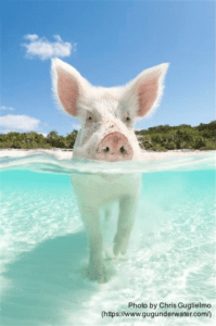 Gug explained that the picture was taken in the Caribbean, just off the beach of an uninhabited Bahamian island officially named Big Major Cay. He told us that years ago, a local entrepreneur brought a drove of pigs to the island to raise for bacon. Gug went on: